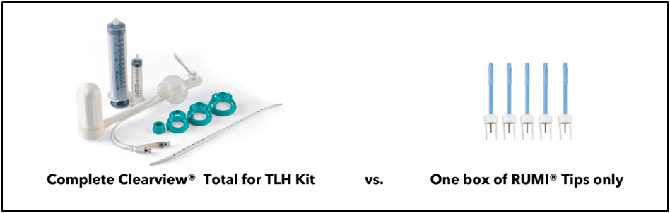 The ClearView® rates quite competitively compared to the RUMI® II. The price for a complete ClearView® Kit, including a 10ml Syringe, 60ml Syringe, Uterine Sound-Dilator and 3 x Colpotomy Cups (see image below), is comparable in price to one box of disposable RUMI® tips only (see image below). On top of this, you have the reusable RUMI® shaft, the Koh-Efficient™ colpotomy cup and occluder balloon component, and the other items required for the procedure, which need to be used as separate off-the-shelf products when using the RUMI® II for a TLH.